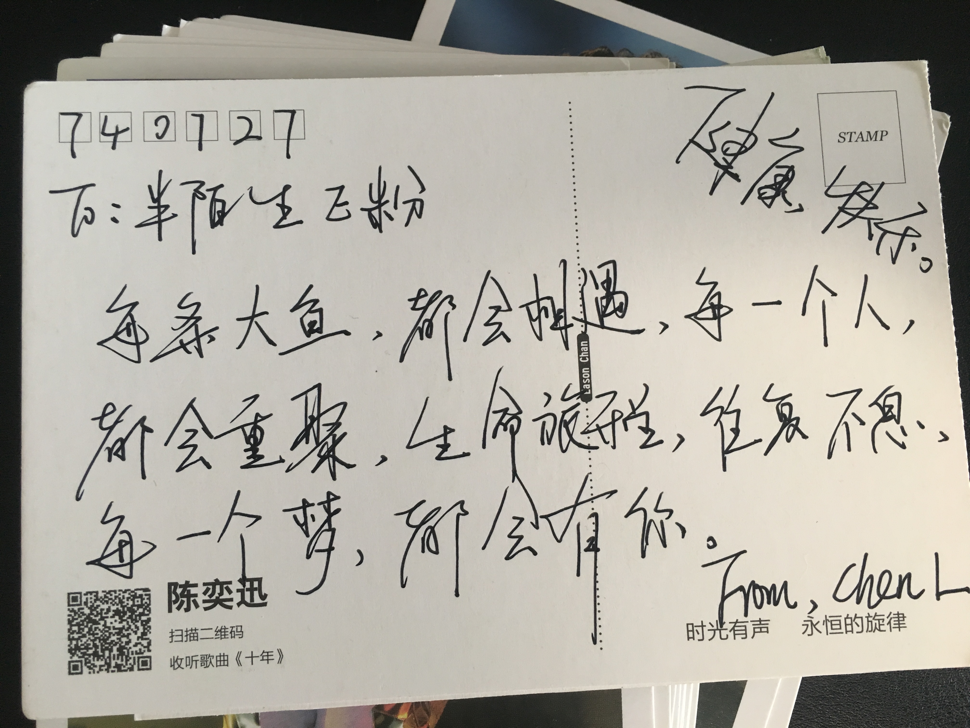 人有时候越长大就会摒弃以前小时候做的一些事情,比如写卡片这件事。 今天收的这两张Eason的CD (SHALL WE DANCE? SHALL WE TALK! 和 THE KEY), 卖家当时说送我一盒Eason的卡片,我当时也没觉得有什么,只是简单的说了声谢谢, 但是收到后第一眼看到他手写的卡片,真的是挺激动的,而且是没有料到的惊喜。